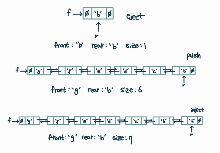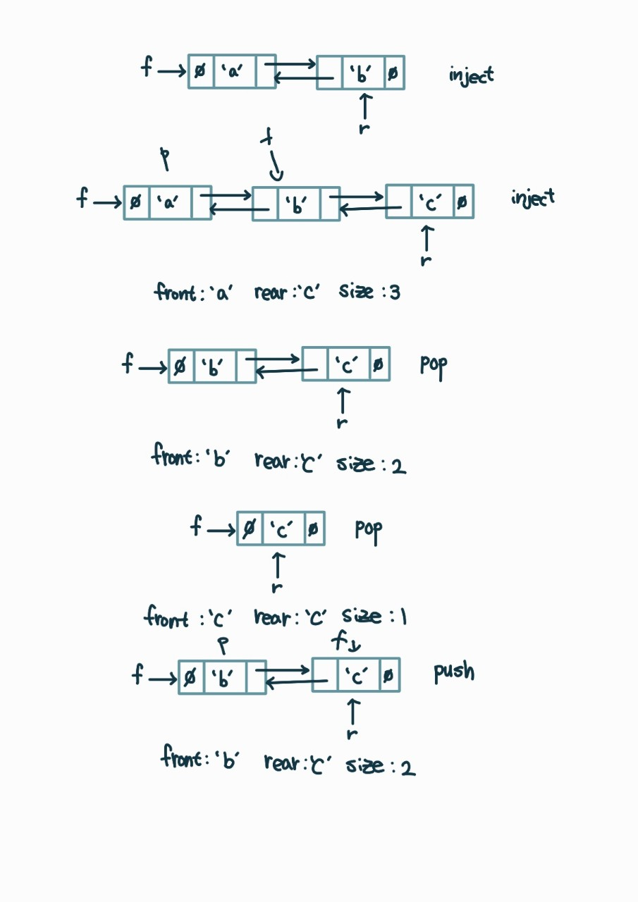 큐와 마찬가지로 덱의 맨 앞과 맨 끝을 가리키는 front / rear가 존재하고 양쪽 모두에서 삽입과 삭제가 이루어진다.