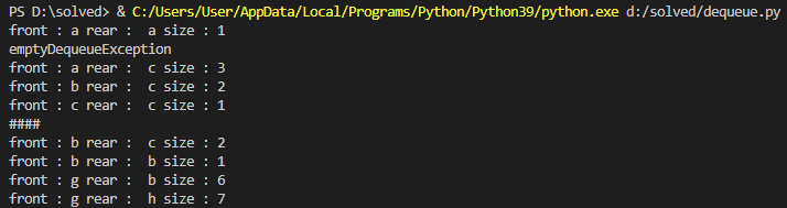 print('front :', Deq.front(), 'rear : ', Deq.rear(), 'size :', Deq.size())