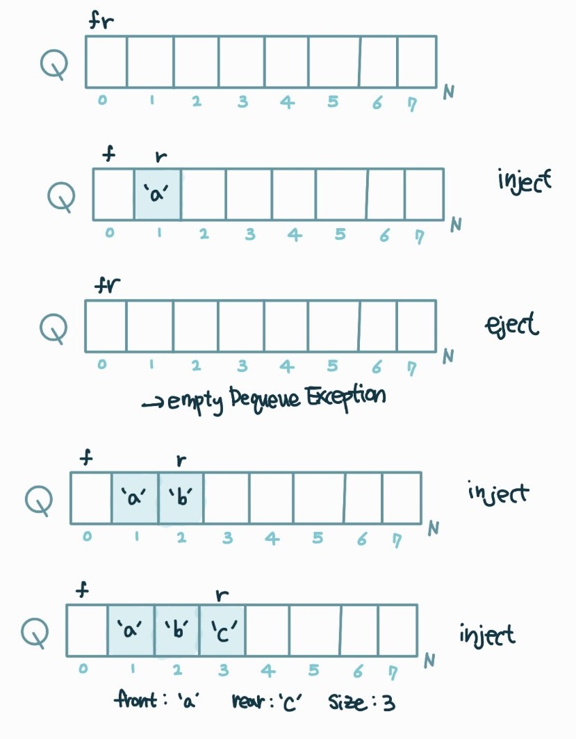 큐의 경우와 마찬가지로 만원 덱과 빈 덱을 구별하기 위해 배열 한 칸을 비워두고 채운다.
