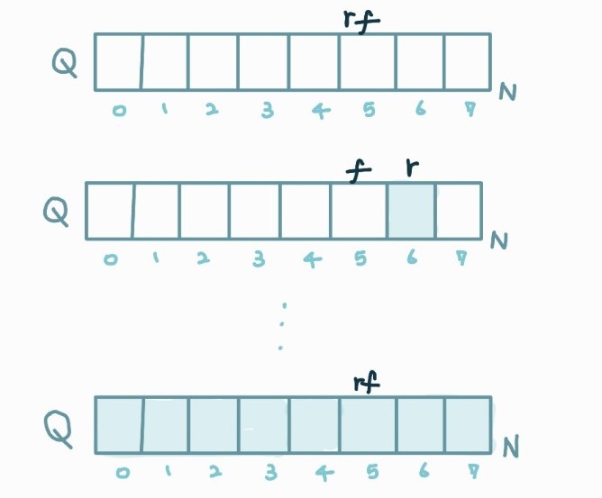 - 변수 f = front 원소의 인덱스, 변수 r = rear 원소의 인덱스