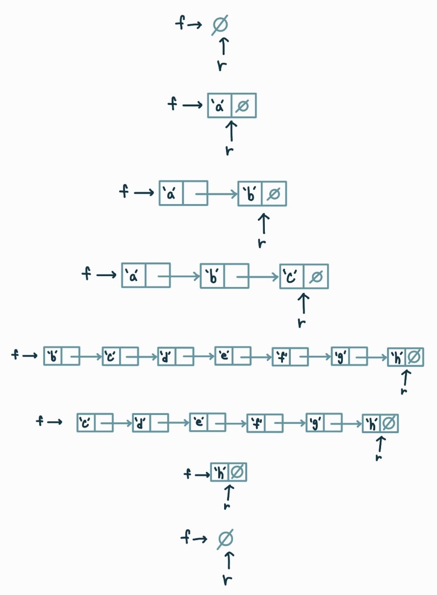 위에서 살펴본 원형배열로 구현할 경우 빈 큐와 만원 큐의 구별이 힘들어진다 (f, r이 돌아가면서 순서가 바뀔 수 있기 때문)