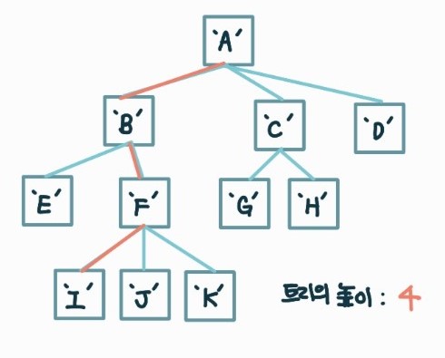 - 노드의 깊이 (Depth) : 루트 노드로부터 해당 노드에 이르는 유일한 경로의 길이