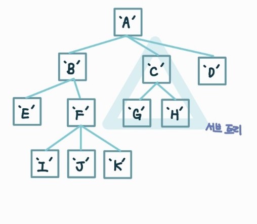 - 서브 트리 (Sub-Tree) : 큰 트리의 구성 요소인 작은 트리