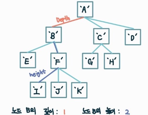 - 트리의 높이 : 루트 노드의 높이