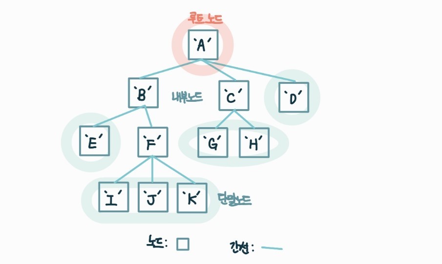 - 단말 노드 (Terminal Node, Leaf node, External Node) : 최하위 노드 (자식 노드가 존재하지 않는 노드)
