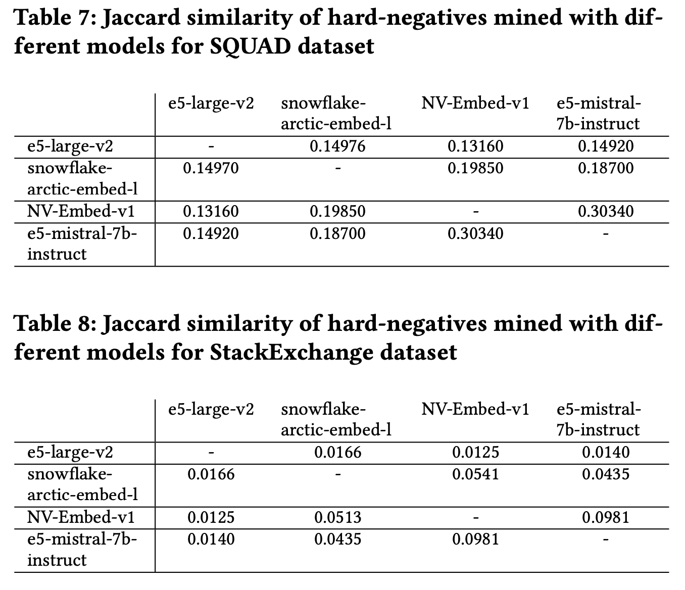 - snowflake-artic-embed-l : hard negative mining에 대해 다양한 최대 점수 임계값을 실험하는 연구 진행