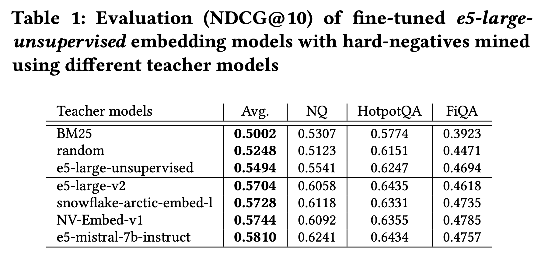- Teacher model로는 가장 좋은 성능을 보인 E5-mistral-7B을 사용