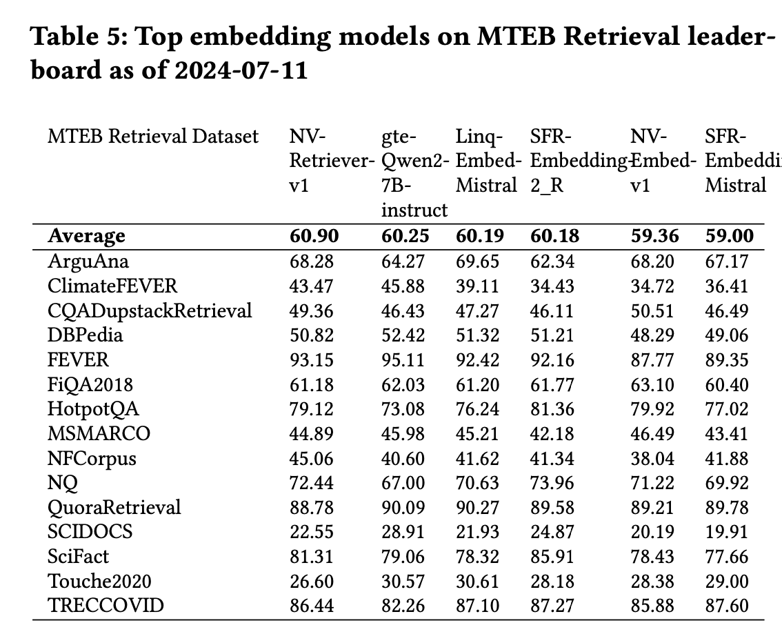 - NV-embed-v1, e5-mistral-7b (Mistral 기반, 7B) 은 가장 높은 정확도