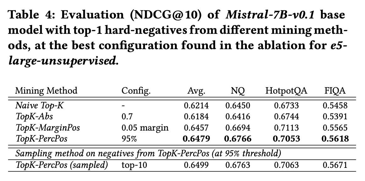 - Mining 비교 실험이 e5-large-unsupervsied (334M) 와 다른 크기인 모델에도 일반화될 수 있는지 확인하기 위해 Mistral-7B-v0.1을 base model로 놓고 동일한 실험 진행