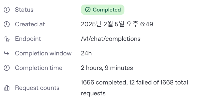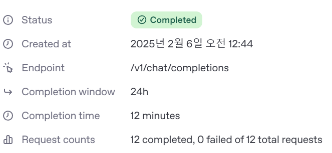 - 공식 Document가 잘되어있어서 참고하는게 좋다 (https://platform.openai.com/docs/guides/batch)