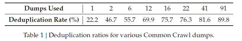 이 때 Common Crawl corpus 데이터셋에서의 중복 제거를 더욱 효과적으로 하기 위해, single dump에서의 중복제거를 하는 것이 아니라 사용한 전체 dump에서의 중복 제거를 진행했다.