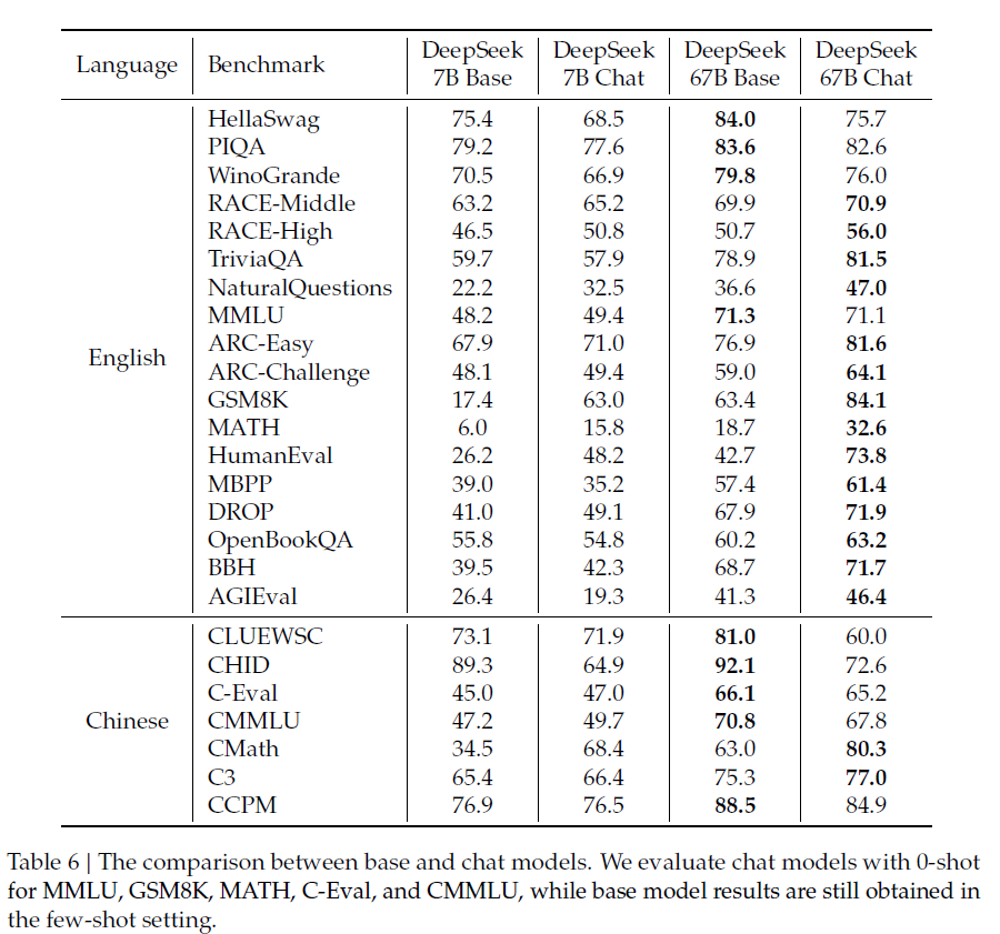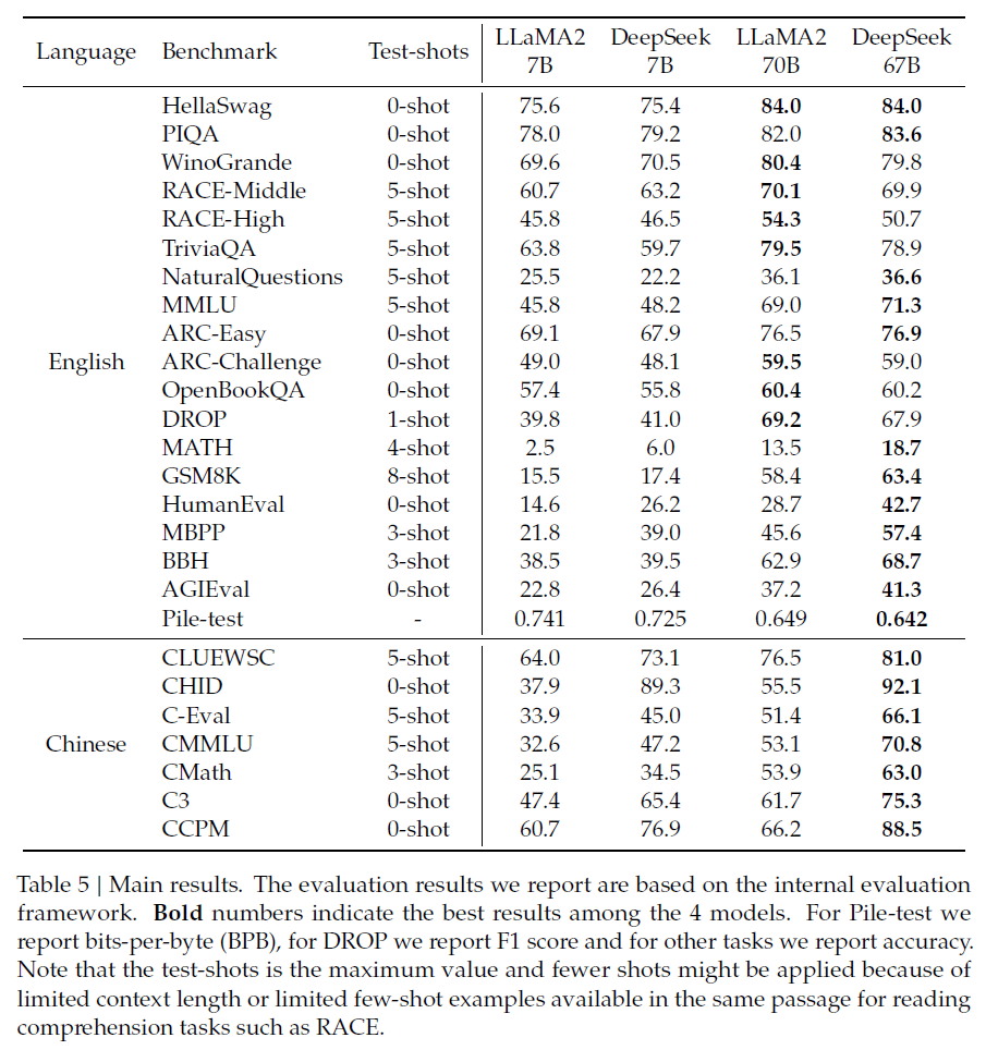 평가 결과, Deepseek-67B는 다양한 벤치마크 (특히 코드, 수학, 추론 영역) 에서 LLaMA2-70B를 능가했고 open-ended evaluation에서는 Deepseek-67B-chat 모델이 GPT-3.5를 능가했다.