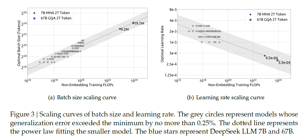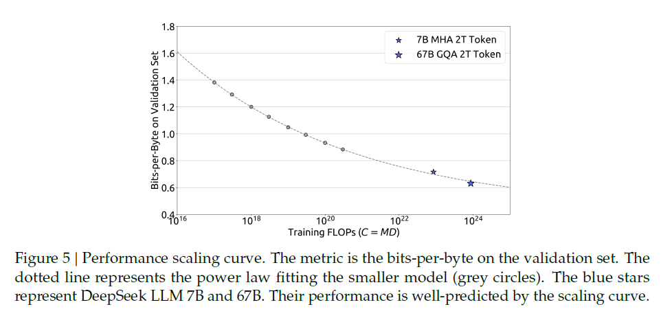 컴퓨팅 예산 C와 일반화 오차에 따라 loss scaling curve를 fitting한 결과 Deepseek LLM 7B와 67B의 Loss 값을 예측할 수 있엇다.