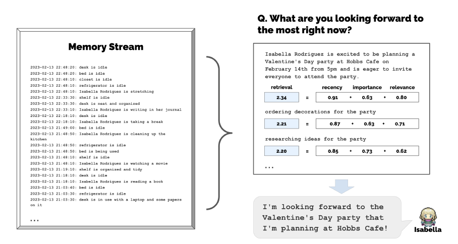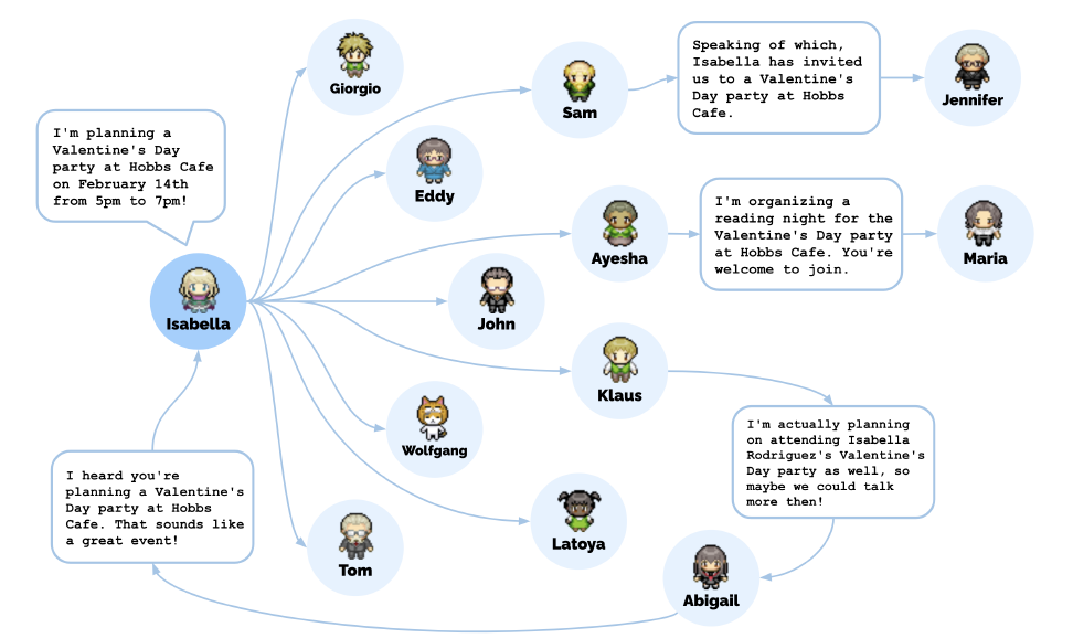 - 이 Seed memory를 바탕으로 에이전트는 홉스 카페나 다른 곳에서 친구나 고객을 만나면 파티에 초대한다.