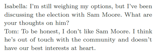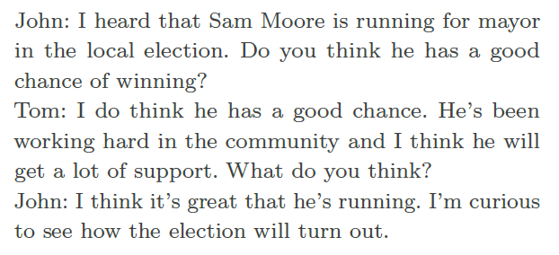 예를 들어 식료품점에서 샘과 톰이 대화를 나누던 중 샘이 톰에게 지방 선거 출마에 대해 이야기한다고 가정하면,