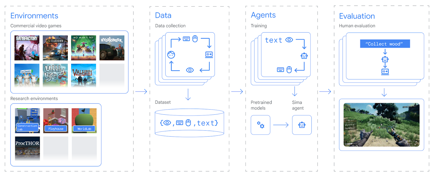 이번 SIMA 프로젝트에서는 연구용 환경부터 상업용 비디오 게임까지, 다양한 3D 가상환경에서 자유형(free-form) 언어 지시를 따르도록 에이전트를 훈련하는 방식으로 이 문제에 접근한다. 즉 인간이 할 수 있는 어떤 행동이든, 어떤 시뮬레이션된 3D 환경에서도 수행할 수 있는 ‘지시 가능(instructable)’ 에이전트를 개발하는 것이다.