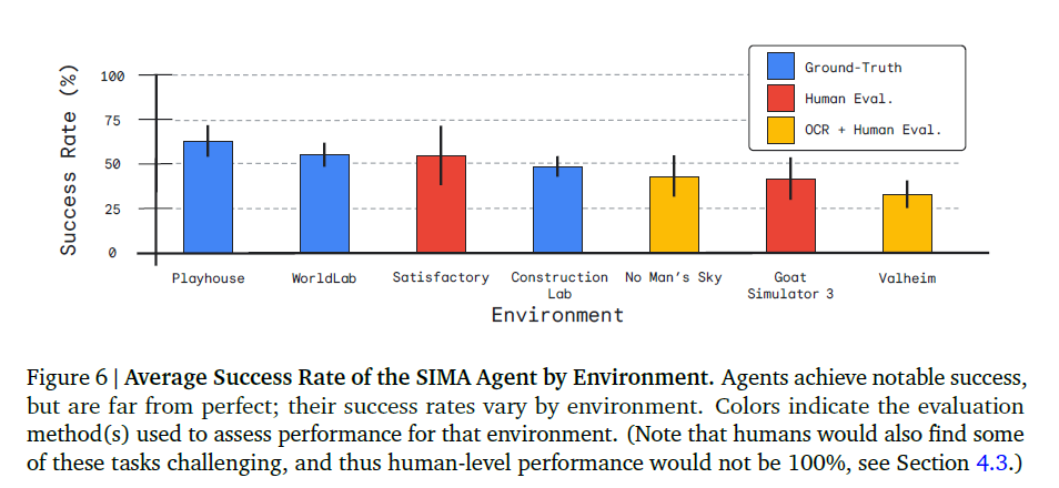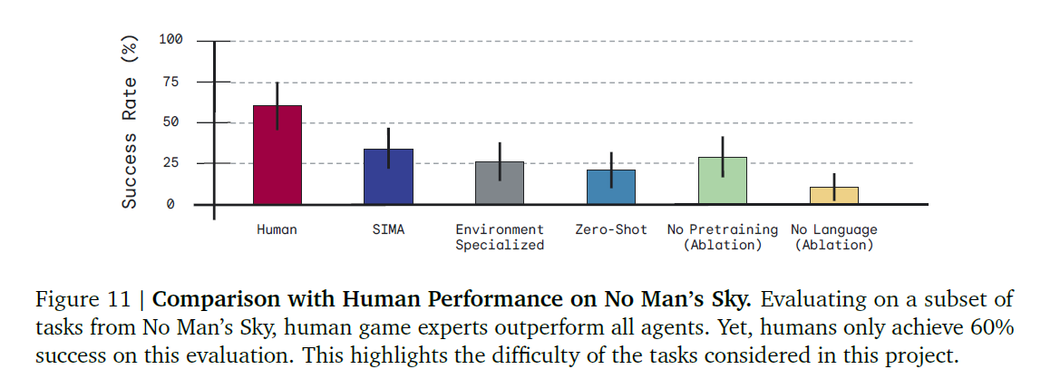 - SIMA 에이전트는 의미 있는 성능을 달성했으나, 아직 인간 성능에 도달하기 위해서는 상당한 진전이 필요하다