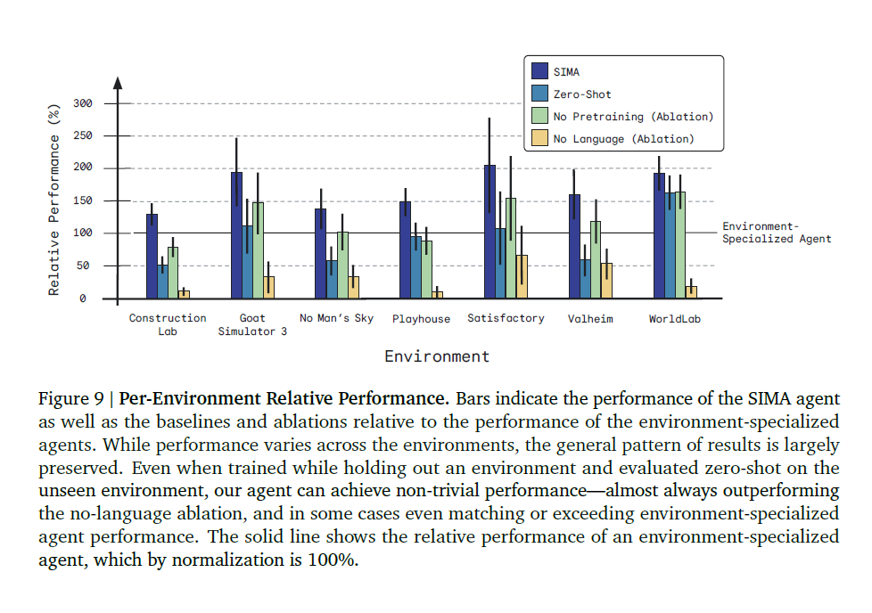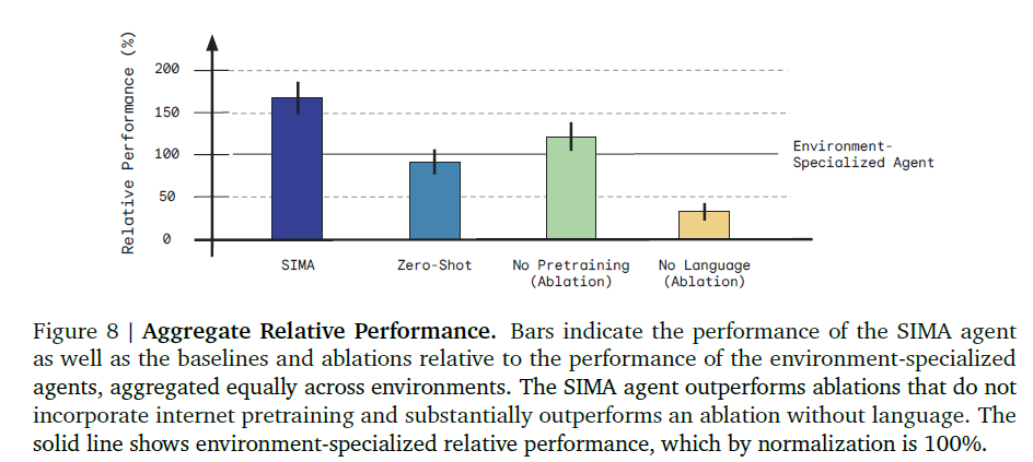- SIMA는 전체적으로 환경 전문 에이전트보다 성능이 뛰어남