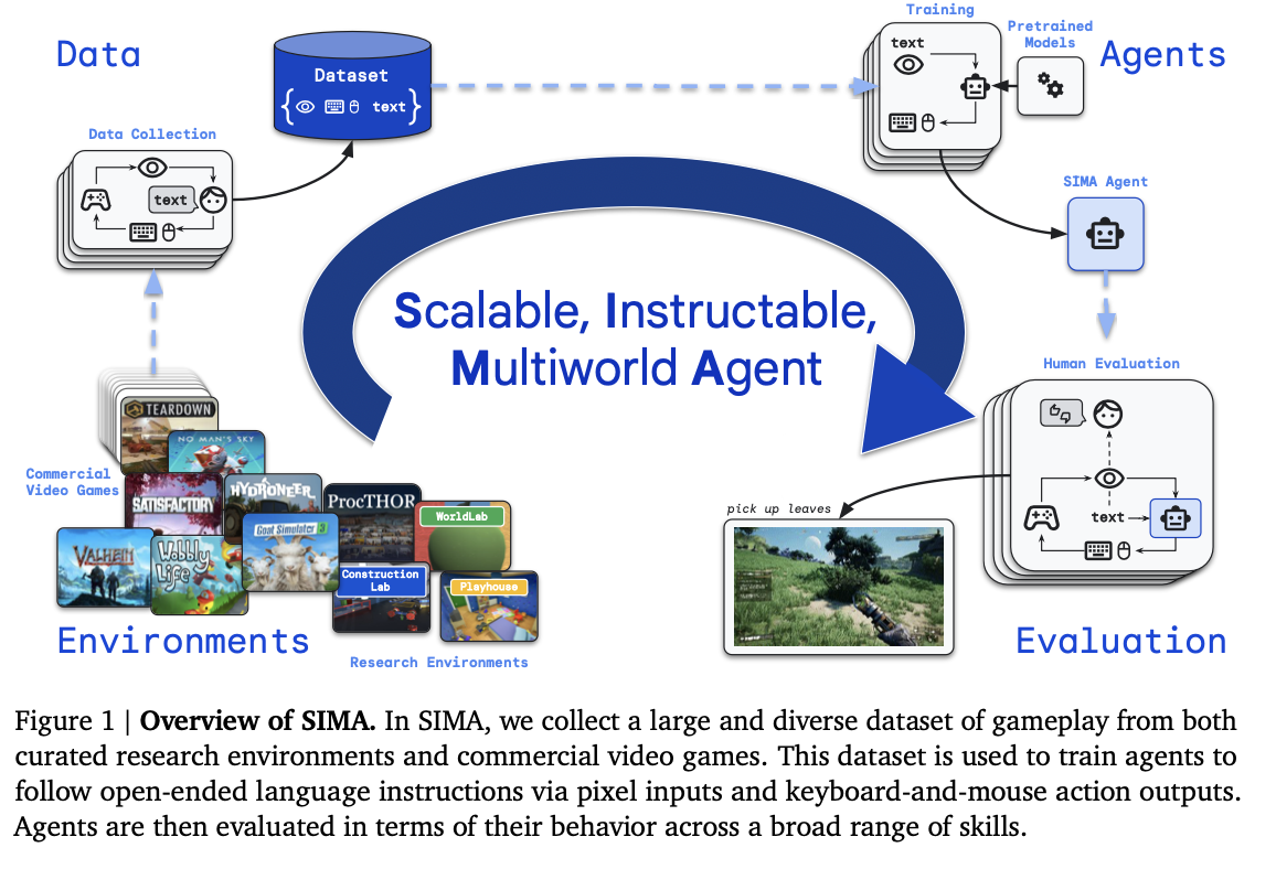SIMA 에이전트는 시각적 관찰(이미지) + 지시 사항(텍스트) → 키보드/마우스 행동으로 매핑한다.