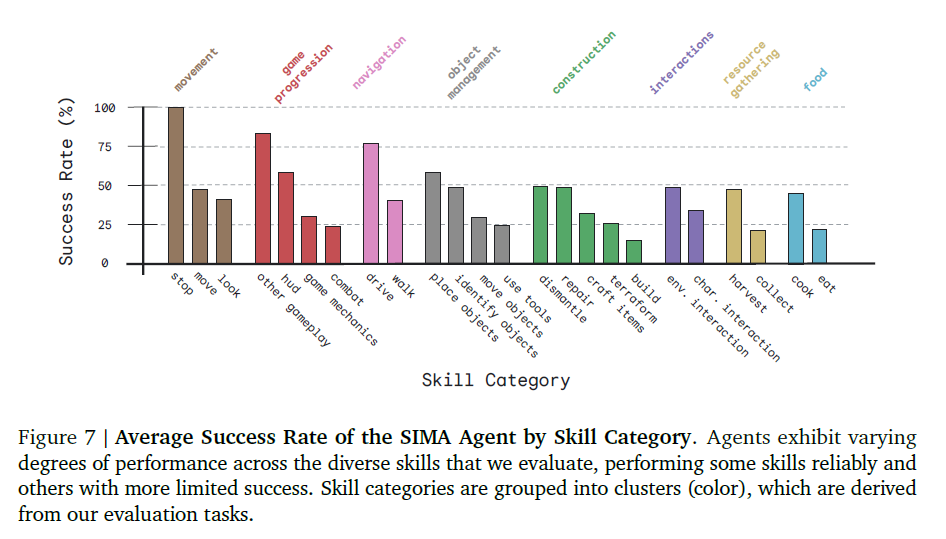 - 환경 및 기술 범주별로 세분화된 SIMA 에이전트의 정량적 성능을 고려