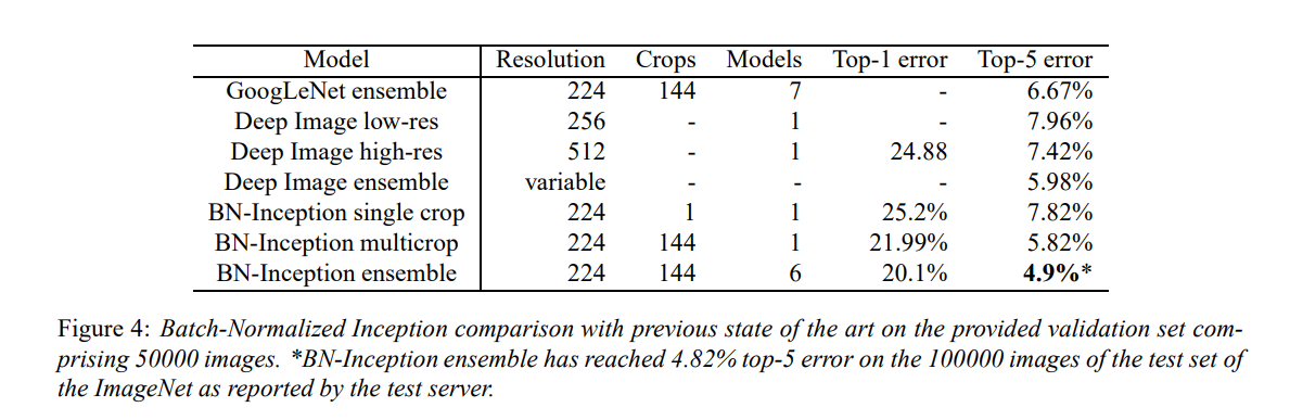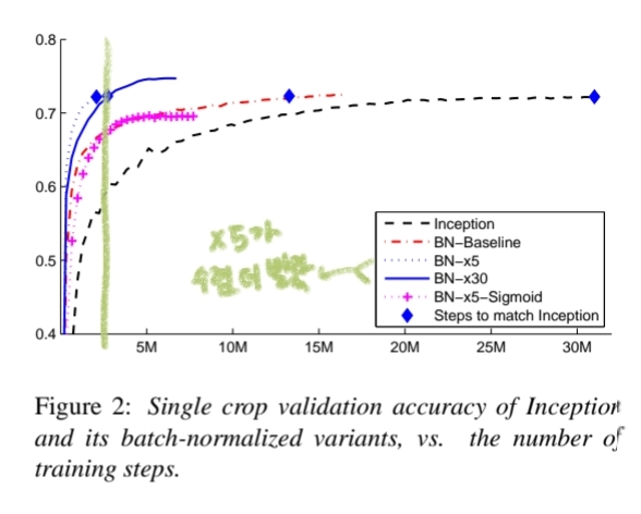- BN-x5 : Inception에 Batch Normalization 적용 및 섹션 4.2.1에서의 변경 사항 (학습률 높이기, dropout 없애기 등) 적용. 초기 학습률은 5의 배수로 0.0075까지 증가. 기존 Inception 모델에 증가를 적용할 경우 model explode 발생