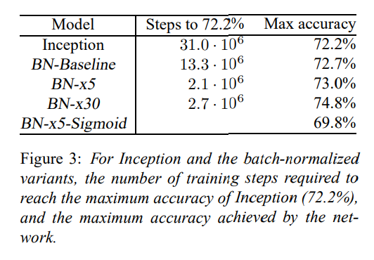 - Batch Normalization만 사용하여 (BN-baseline) 학습 step 수를 절반 이하로 줄이면서 Inception의 정확도에 도달