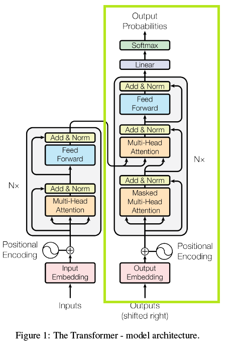 인코더 층과 다른 점은 Auto-regressive 속성 유지를 위해서 이전 토큰의 참조를 방지해야 한다는 것이다.