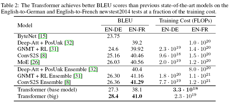 영어-독일어 번역 작업에서 큰 모델 (big으로 기재되어있는 모델) 이 SOTA (앙상블 포함) 를 2.0 BLEU 이상 능가했으며 기본 모델도 이전에 발표된 모델들을 능가하였다.