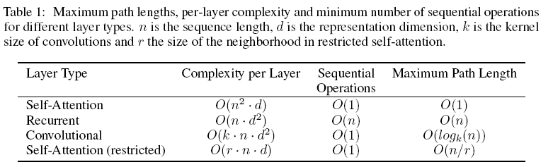 표 1에서 볼 수 있듯 셀프 어텐션 층에서는 모든 위치를 상수 연산으로 연결하는 반면 RNN 층은 O(n)의 순차적인 연산이 필요하다.