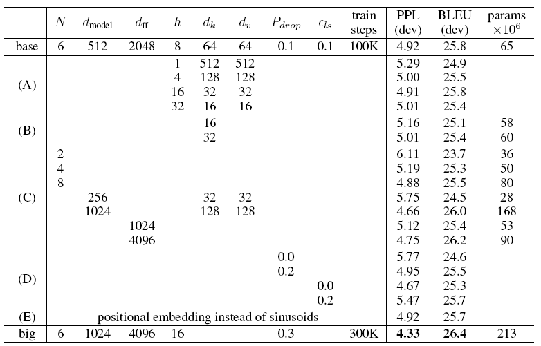 - E행 : 포지셔널 인코딩을 학습된 위치 임베딩으로 대체 = 기본 모델과 거의 동일한 결과