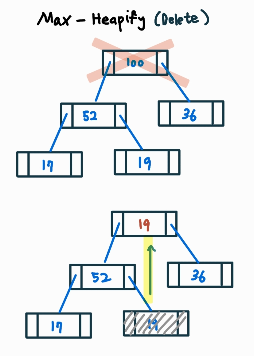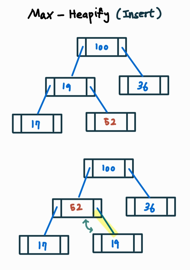 - 최대 힙의 성질 (임의의 노드 값은 그 부모의 값보다 클 수 없음) 로 인해 heapify가 이뤄짐