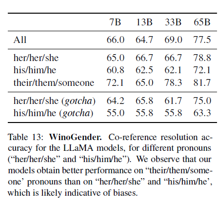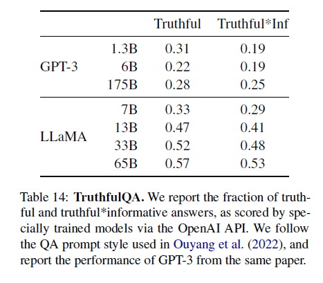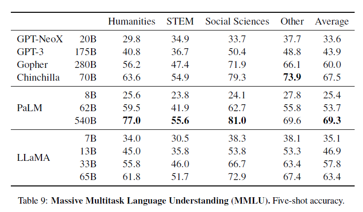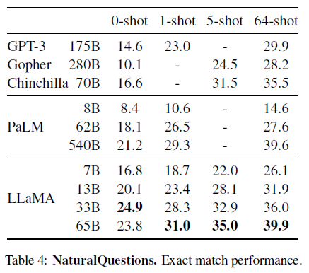 - LLaMa-65B는 대부분의 영역에서 Chinchilla-70B, PaLM-540B보다 몇 퍼센트 떨어짐