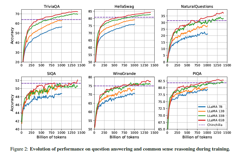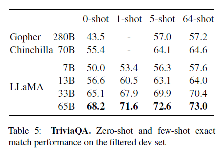 - LLaMA-65B는 BoolQ를 제외한 모든 벤치마크에서 Chinchilla-70B를 능가