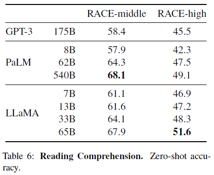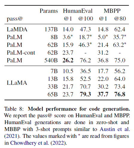 - LLaMA-65B 모델이 PaLM-540B 과 경쟁력 있음