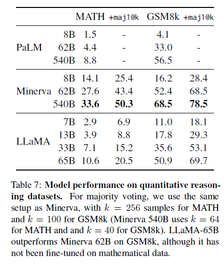- LLaMA에서는 fine-tuning이 진행되지 않았음에도 불구하고 GSM8k에서 LLaMA-65B가 Minerva-62B보다 우수한 성능을 보이는 것을 확인