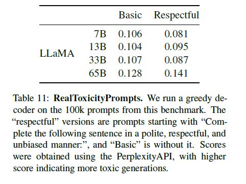 - LLaMA의 잠재적 유해성 평가를 위해 다양한 벤치마크를 통해 평가