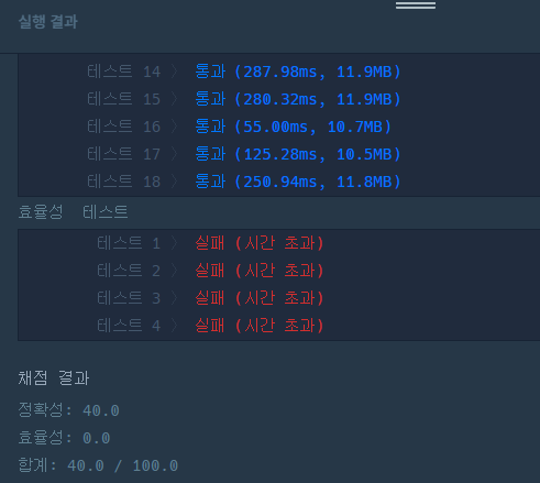 테스트 케이스는 통과했으나 효율성 테스트에서 여지 없이 실패..ㅠㅠ