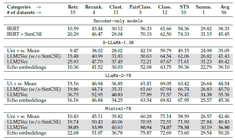 실제로 대부분의 모델에서는 bidirectional attention만 enable 했을 때, embedding performance가 감소하는 모습을 보였다.