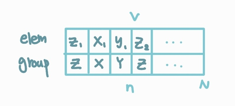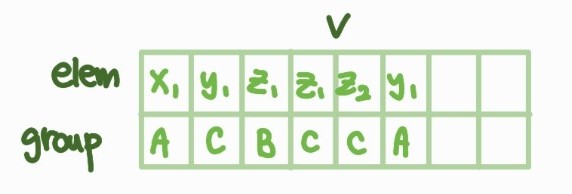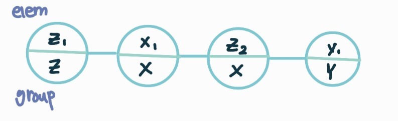 "그룹" 을 표현하기 위해 원소 및 그룹 필드로 구성된 리스트를 사용한다.