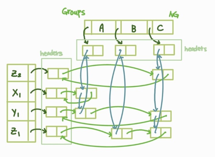 구현은 간단하지만, 특정 그룹에 관한 작업을 위해 전체 레코드를 순회해야 한다는 단점이 존재한다.